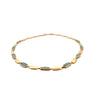 This elegant 9ct yellow gold necklace showcases a series of luminous aquamarine cabochons in oblong form, each delicately bezel-set and interspaced with complementary gold links of matching geometry. A refined piece that captures the serene beauty of aquamarine in a timeless design. Coordinating earrings are available to complete the set.