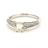 18ct white gold diamond ring featuring 1 x 0.47ct baguette cut diamond claw set, with knife edge band set with two rows of bead set round brilliant cut diamonds totalling 0.18cts. G colour, SI clarity. Finger size M.