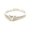 18ct white gold princess cut diamond engagement ring featuring 0.30ct princess cut diamond set in 4 claw setting, of H colour, SI clarity with bead set round brilliant cut diamonds totaling 0.25cts with mille-grain edges. Finger size O.