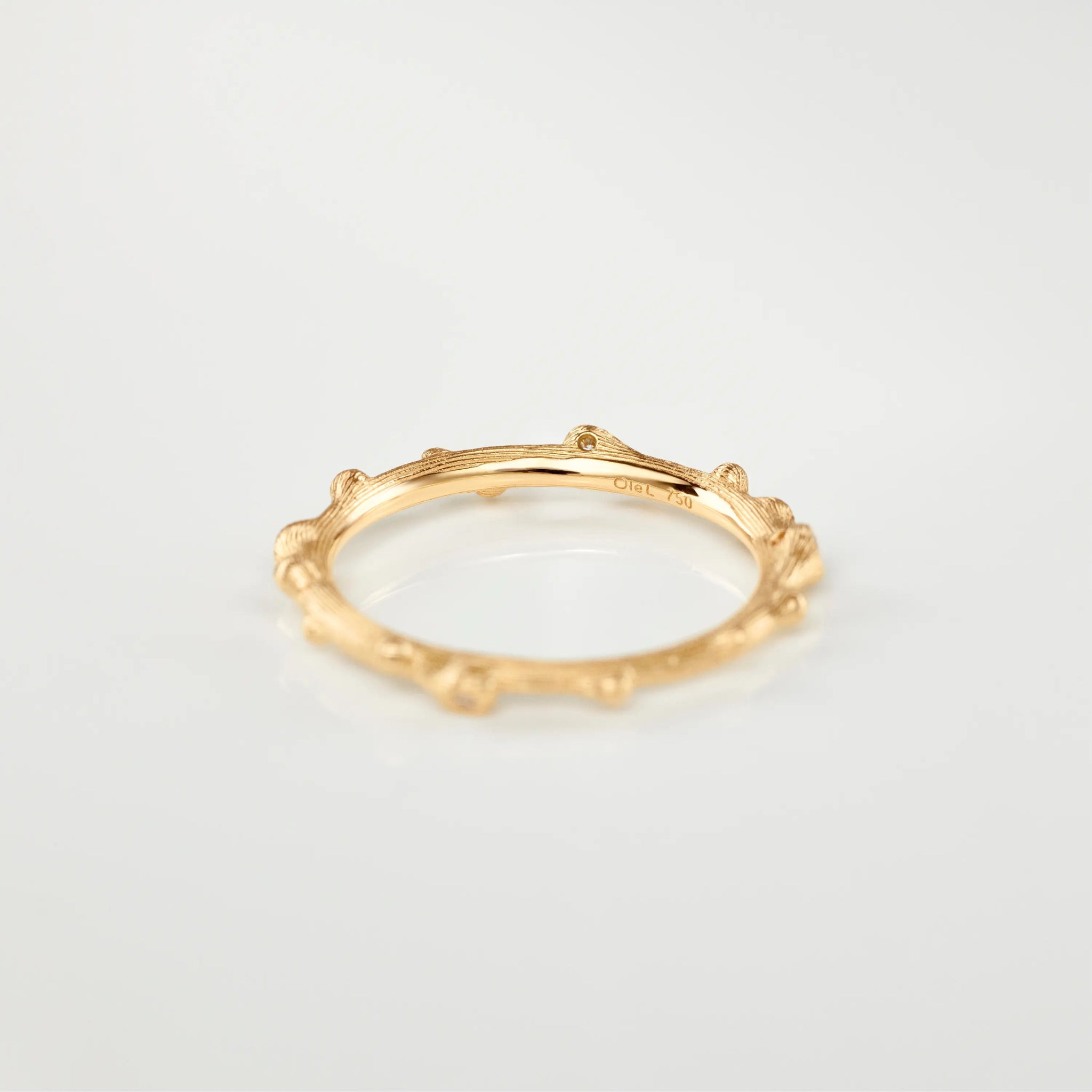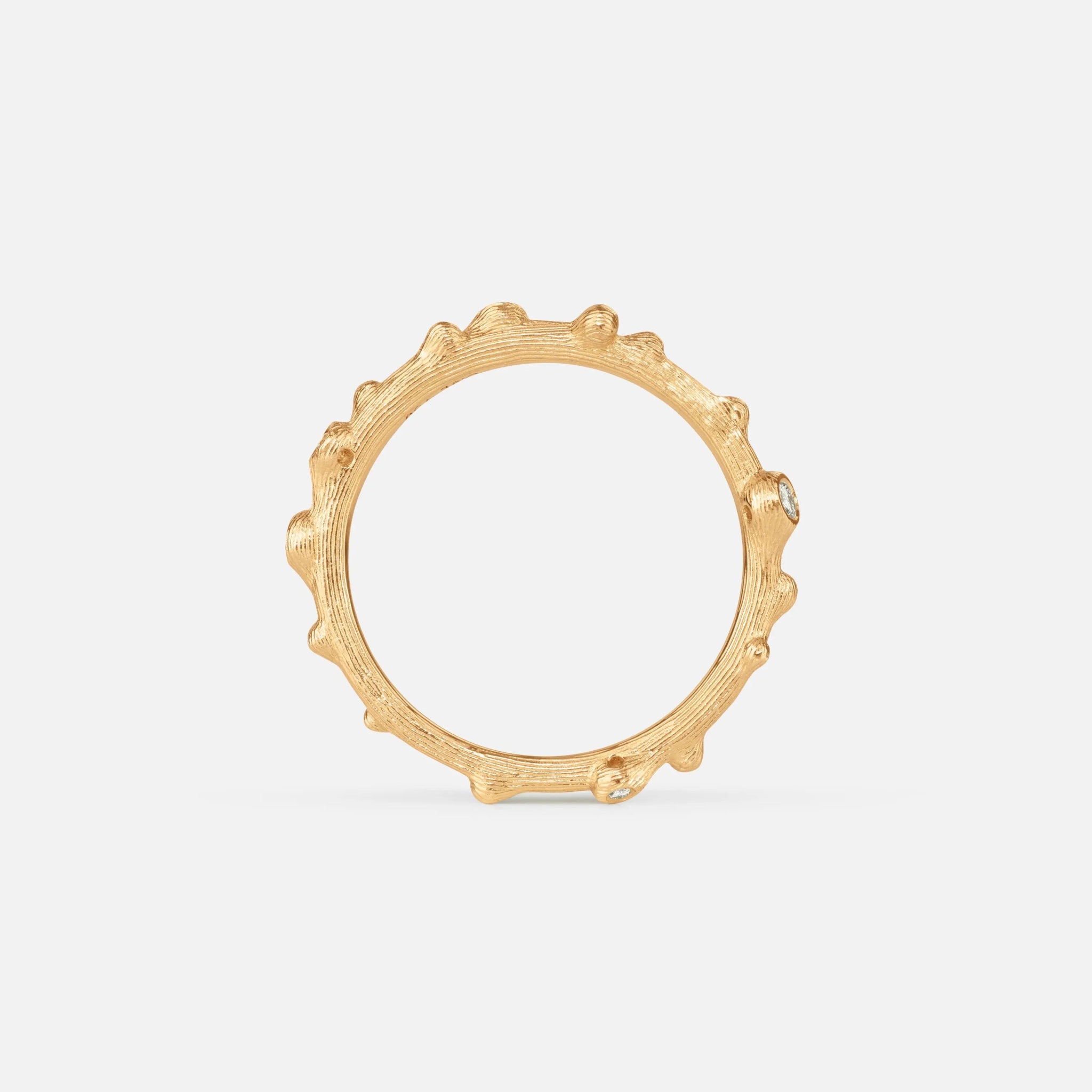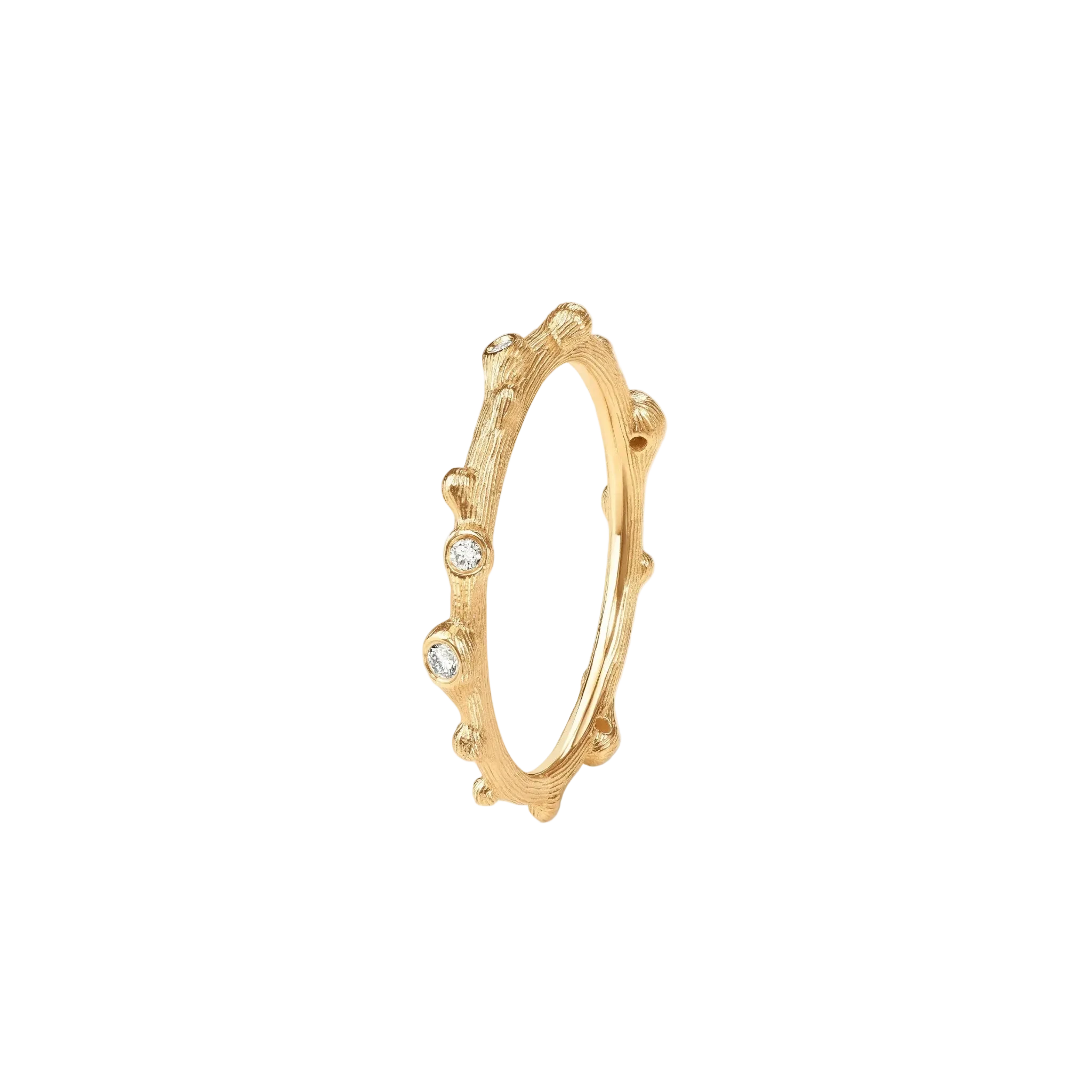 Designed by Charlotte Lynggaard, the Nature ring is crafted from 18 karat yellow gold with 5 bezel-set diamonds totalling 0,04 carat TW. VS. The gold surface is sculpted and satinised by hand by master goldsmiths. Part of the Nature Collection.
